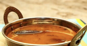 To start with, boil soaked toor dal and keep aside. Then, prepare a masala mix with hing, ginger, chilli, and some basic spices. Then, add besan to it and fry. Finally, add dal, vegetables, and water (if needed) and boil everything together. Finally, add some tanginess, garnish with coriander leaves, and serve hot, with a bowl of steamed rice. Click here for the detailed recipe of Sindhi dal kadhi.